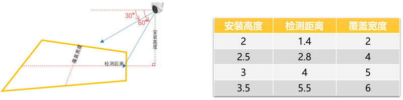 安裝指導(dǎo):攝像機(jī)安裝的傾斜角度為鏡頭中軸線與水平夾角30°-60°之間,攝像機(jī)的場(chǎng)景覆蓋能力約為5*5m,即離攝像機(jī)距離、門寬大小。
